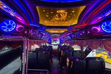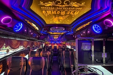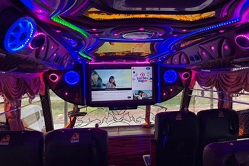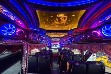 ภายในชั้นบน ปรับเอนนอน 39 ที่นั่ง ภายในรถชั้นล่างเก้าอี้4ที่นั่งพร้อมโซฟารูปตัวUนั่งได้4-6ท่าน สะดวกสบายพักผ่อนประชุมงานหรือสังสรรค์ในหมู่คณะ ทีวีขนาดใหญ่ชั้นบน2เครื่อง ชั้นล่าง1เครื่องพร้อมระบบเครื่องเสียงเต็มรูปแบบ คาราโอเกะสุดฮิต Free WiFi ช่องเสียบ USB ทุกที่นั่ง มีกาต้มน้ำร้อน ถังน้ำแข็ง มีประกันภัยทุกที่นั่ง มีระบบเข็มขัดนิรภัย 3 ชุด ประตูฉุกเฉิน 2 ประตู พร้อมถังดับเพลิง น้ำดื่มขวด 600 ml. กาแฟ โอวัลติน ผ้าห่ม (สำหรับการเดินทางแบบข้ามคืน) |